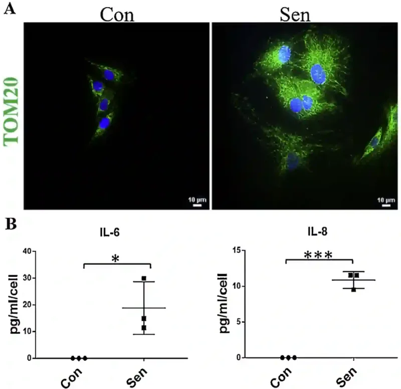 Abbildung 1. Seneszente Zellen haben mehr Mitochondrien und setzen mehr Entzündungssignale frei. (A) Seneszente Zellen (mit der Bezeichnung „Sen“) enthalten mehr Mitochondrien als gesunde Kontrollzellen („Con“), wie das hellere grüne Signal (der Biomarker TOM20) in den Fluoreszenzmikroskopiebildern zeigt. (B) Diese seneszenten Zellen setzen im Vergleich zu gesunden Zellen auch mehr Entzündungsmoleküle (IL-6 und IL-8) frei, was darauf hindeutet, dass sie sich in einem gestressten oder entzündeten Zustand befinden. Abkürzung: IL, Interleukin; TOM20, Translokase der äußeren Mitochondrienmembran 20. Quelle: Patil et al. (2019), Mechanisms of Ageing and Development.