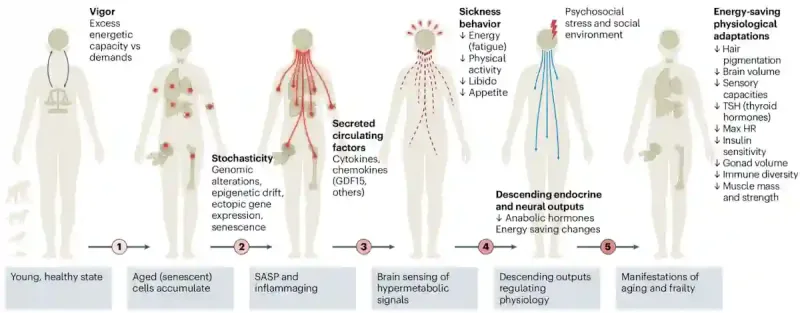 Das Gehirn kann als Finanzmanager des Körpers betrachtet werden, der ständig die Energieeinnahmen und -ausgaben im Gleichgewicht hält. Wenn geschädigte und gealterte Zellen zusätzlichen Energiebedarf haben, setzen sie Zytokine (Entzündungsbotenstoffe) und Metaboliten in den Blutkreislauf frei. Diese Signale gelangen zu spezialisierten Hirnregionen im Hypothalamus und Hirnstamm, die für die Wahrnehmung und Steuerung des Energiehaushalts im Körper zuständig sind.