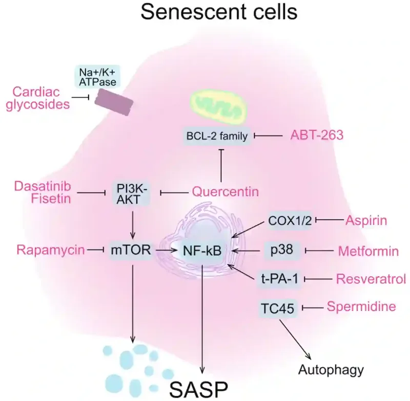 Abbildung 3. Wie verschiedene senolytische Wirkstoffe die Zellprozesse von alten, seneszenten Zellen hemmen. Zu den Wirkstoffen gehören synthetische Medikamente (z. B. ABT-263, Aspirin, Rapamycin, Metformin und Dasatinib) und natürliche Pflanzenstoffe (Spermidin, Resveratrol, Fisetin und Quercetin). Durch die Blockade bestimmter Zellprozesse lösen diese senolytischen Wirkstoffe entweder die Selbstzerstörung seneszenter Zellen aus oder dämpfen ihre Entzündungssignale. Dadurch wird das Energiegleichgewicht wiederhergestellt und Energie für gesündere Zellen freigesetzt. Hinweis: SASP steht für Seneszenz-assoziierter sekretorischer Phänotyp und beschreibt den hyperaktiven Zustand seneszenter Zellen bei der Sekretion von Entzündungs- und Stresssignalen. Quelle: Yu et al. (2024), Cell Regeneration.
