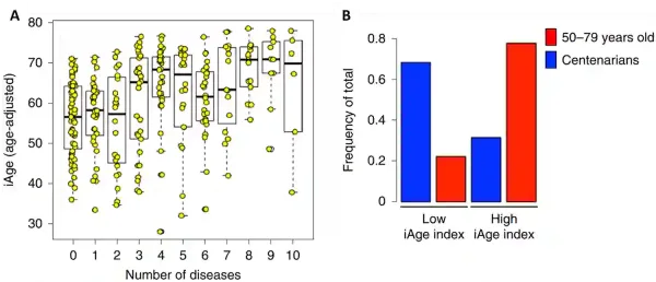 Figure 1. The immunome tracks well with the number of chronic diseases (A) and exceptional longevity (B). A healthy immunome is characterised by a low iAge (inflammatory ageing clock) index. Source: Sayed et al. (2021), Nature Aging.