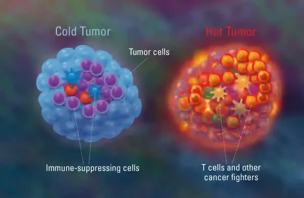 Figure 2. An illustration of cold vs. hot tumour. Cold tumours have lower immune activities as the cancer cells are hiding from the immune system. Hot tumours have higher immune activities due to the infiltration of immune cells aimed at attacking the cancer cells, resulting in a pro-inflammatory environment. Source: Freeman (2018), Dana-Farber Cancer Institute.