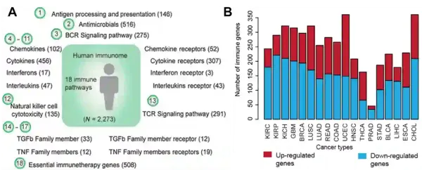 Figure 3. The human immunome in cancer. (A) The human immunome is categorised into 18 pathways, with the number of genes in each pathway in brackets. (B) The activities of immune-related genes across cancer types. Red for up-regulated genes and blue for down-regulated genes. Examined cancer types include kidney (e.g., kidney renal clear cell carcinoma, KIRC and kidney renal papillary cell carcinoma, KIRP), brain (e.g., brain lower grade glioma, LGG and glioblastoma multiforme, GBM), breast, lung, colorectal, uterus, thyroid, head and neck, liver and oesophagus cancers, among others. Source: Li et al. (2020), Cancer Research.