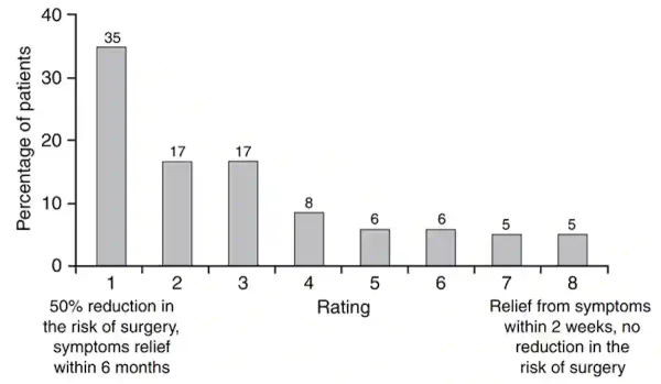 Figure 3. Patient preferences for drug attributes rated on a scale of 1-8. A score of 1 represents a drug that reduces the risk of surgery by 50% with symptom relief starting within 6 months; a score of 8 represents a drug offering rapid symptom relief within 2 weeks but no reduction in the risk of surgery. The majority (77%) rated ≤4, indicating a preference for a drug that prioritises long-term rather than short-term outcomes. Source: Emberton et al. (2008), The International Journal of Clinical Practice.