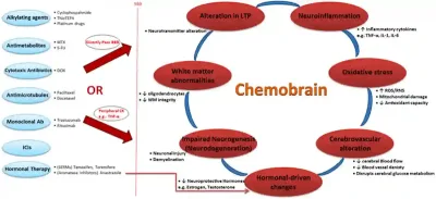 Figure 1. Mechanisms driving chemobrain or chemotherapy-induced cognitive impairments. Abbreviations/acronyms: 5-FU, 5-fluorouracil; BBB, blood-brain barrier; CK, cytokines; DOX, doxorubicin; ICIs, immune checkpoint inhibitors; LTP, long-term potentiation; MTX, methotrexate; ROS/RNS: reactive oxygen/nitrogen species; WM, White matter. Source: Mounier et al. (2020), Life Sciences.