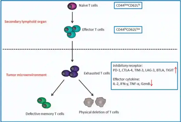 Figure 1. T-cell exhaustion in the tumour microenvironment. Naïve T-cells first differentiate into effector T-cells in the thymus, a secondary lymphoid organ. In the tumour, T-cells may become exhausted if repeated efforts to eradicate the tumour are unsuccessful. Exhausted T-cells exhibit increased inhibitory receptors and decreased production of anti-cancer cytokines, eventually leading to defective and depleted T-cells. Source: Jiang et al. (2015), Cell Death and Disease.