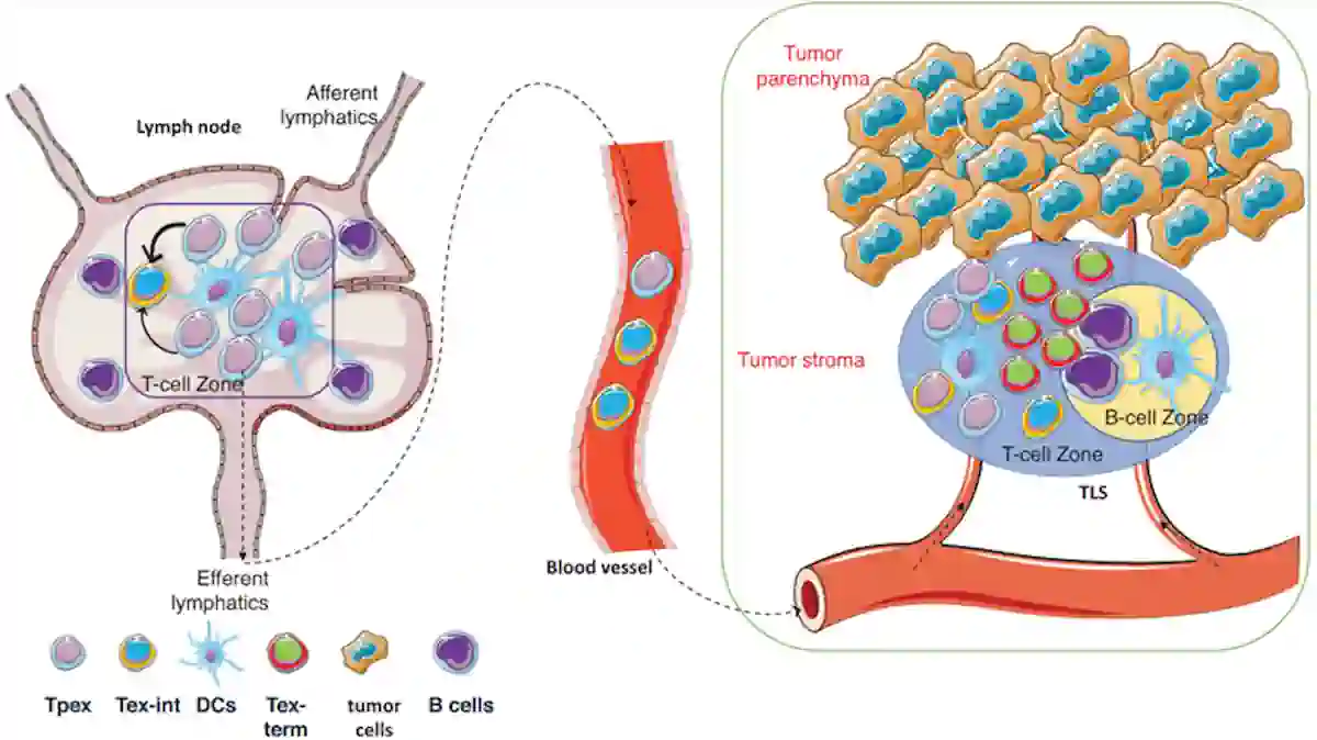 Figure 2. Activation of Tpex cells in cancer. In the tumour-draining lymph nodes, the resident Tpex cells can migrate to the tumour and differentiate into new T-cells that are less exhausted. Abbreviations: Tpex, progenitor exhausted T-cells; Tex-int, intermediate exhausted T-cells; DCs, dendritic cells; and Tex-term, terminally exhausted T-cells. Source: Ni (2024), Clinical and Translational Medicine.