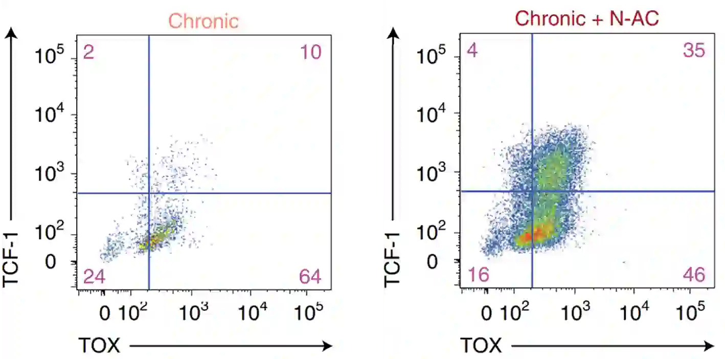 Figure 3. Flow cytometry showing the expression of TCF-1 and TOX in chronically stimulated T-cells (exhausted) with and without NAC treatment. A higher proportion of cells began to express TCF-1 and TOX following NAC treatment. While TCF-1 is a Tpex cell marker, TOX also plays an important role in preserving the stem-like qualities of Tpex cells. Abbreviations: TCF-1, T-cell factor 1; TOX, thymocyte selection-associated high mobility group box protein. Source: Vardhana et al. (2022), Nature Immunology.