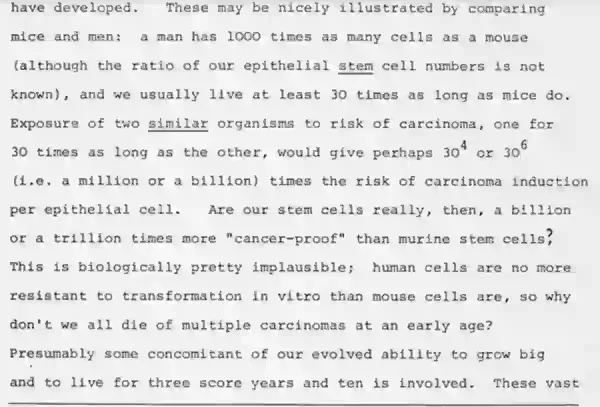 Figure 1. A snippet of the seminal 1977 paper by Richard Peto, whose ingenious writings and observations highlight the paradox between cancer rate and body size across species. Source: Peto (1977), Cold Spring Harbor Laboratory Library.