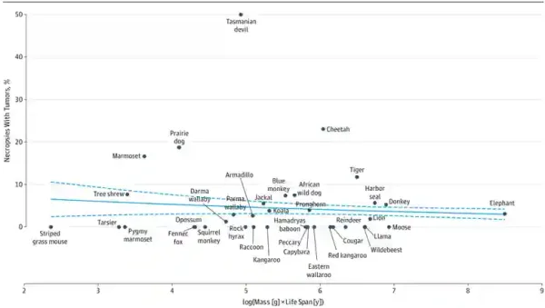 Figure 2. Cancer incidence across species by body size and life span. Larger and longer-lived species are not any more susceptible to cancer than smaller, shorter-lived species. In fact, there may even be a trend towards lower cancer rates in larger, longer-lived species. Source: Abegglen et al. (2015), Journal of American Medical Association (JAMA).