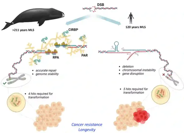 Figure 3. A graphical summary of the cancer resistance and longevity of bowhead whales. Bowhead whales have an exceptionally efficient mechanism to repair DNA damage, thanks to high levels of certain proteins like CIRBP and RPA2. This advanced DNA repair system likely helps them resist cancer, even though it takes fewer genetic changes to make whale cells turn cancerous compared to human cells (i.e., 4 vs. 5 hits). Source: Firsanov et al. (2023), bioRxiv.
